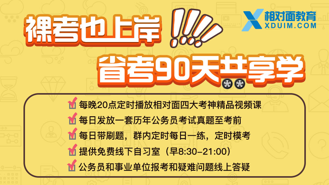 自2019年1月4日起,連續(xù)90個天(春節(jié)放假除外)每晚20:00定時播放,相對面教育唐廣磊、劉洋、方博、宋國棟老師精心錄制的公務員高分精品課,每晚一個知識點精講,讓裸考更簡單。公眾號xduimgk。