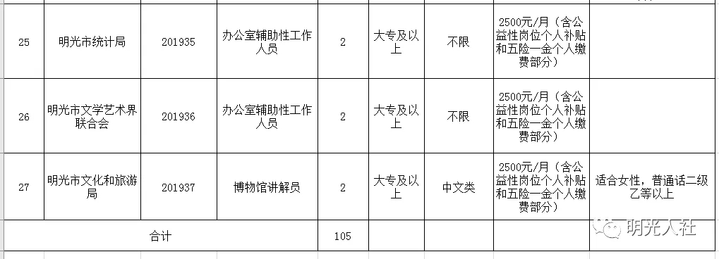 招聘崗位共計(jì)105個(gè)。具體崗位詳見附件《明光市2019年公益性崗位統(tǒng)一招聘崗位表》(以下簡(jiǎn)稱《招聘崗位表》)。