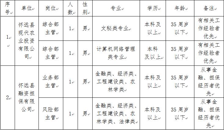 懷遠現(xiàn)代農(nóng)業(yè)綜合開發(fā)示范區(qū)下屬公司:懷遠縣現(xiàn)代農(nóng)業(yè)投資有限公司和懷遠縣融資擔(dān)保有限公司,分別承擔(dān)示范區(qū)投資建設(shè)管理業(yè)務(wù)和對全縣從事現(xiàn)代農(nóng)業(yè)種植戶提供融資擔(dān)保業(yè)務(wù),隨著示范區(qū)工作的全面開展及兩個公司業(yè)務(wù)的發(fā)展,公司現(xiàn)有人員已不能滿足日常工作需要,為了更廣泛地選拔優(yōu)秀人才,擬面向社會公開招聘4名公司工作人員,具體招聘方案如下: