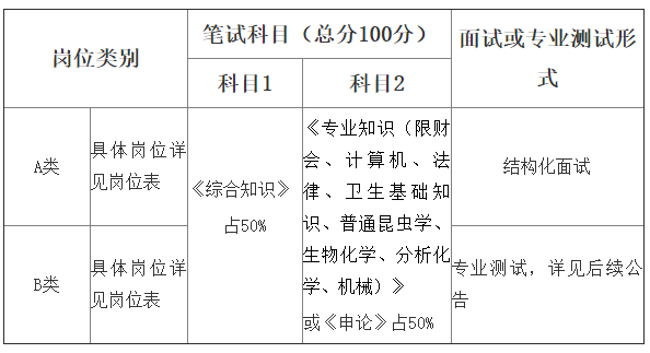 1、筆試工作由市人社部門統(tǒng)一組織,采取閉卷形式進行,考試科目根據(jù)崗位類別如下表: