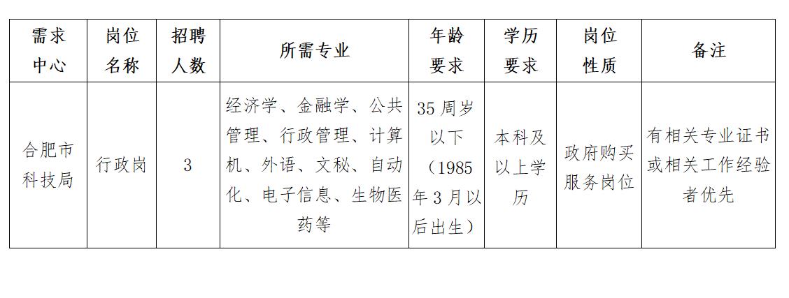 因工作需要,合肥市科學(xué)技術(shù)局現(xiàn)擬面向社會(huì)公開(kāi)招聘政府購(gòu)買(mǎi)服務(wù)崗位工作人員3名?,F(xiàn)就有關(guān)事項(xiàng)公告如下: