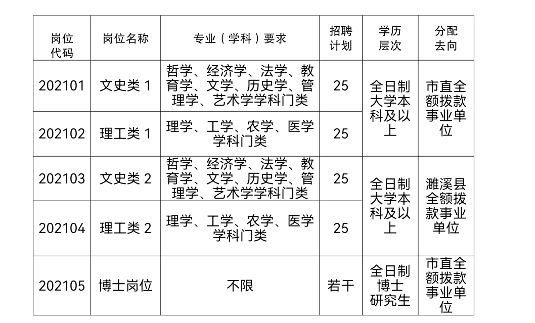 計(jì)劃招聘市直全額撥款事業(yè)單位工作人員50名,濉溪縣全額撥款事業(yè)單位工作人員50名,博士研究生計(jì)劃單列,不受招聘名額限制,崗位如下: