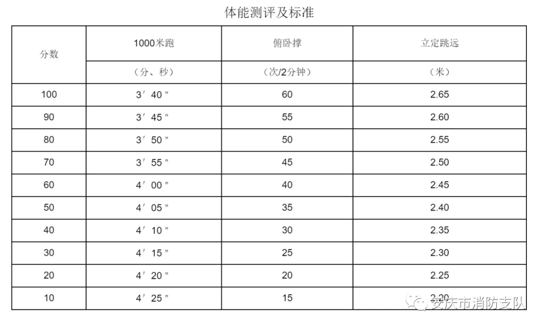 3、體能測評成績:測試成績采取從高到低排名,換算為對應的百分制成績測算,滿分為100分,體能測評三個項目必須達標(60分)。
