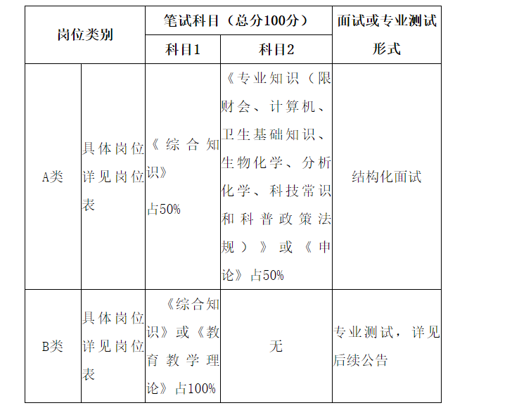 1、筆試工作由市人社部門統(tǒng)一組織,采取閉卷形式進(jìn)行,考試科目根據(jù)崗位類別如下表: