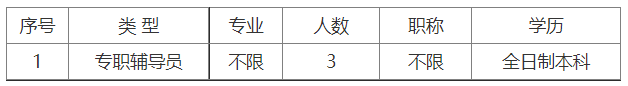 專職輔導(dǎo)員:全日制本科及以上學(xué)歷,要求中共黨員。有心理學(xué)、教育學(xué)、思政類相關(guān)專業(yè)優(yōu)先;有心理咨詢師、就業(yè)指導(dǎo)師證書(shū)的優(yōu)先。