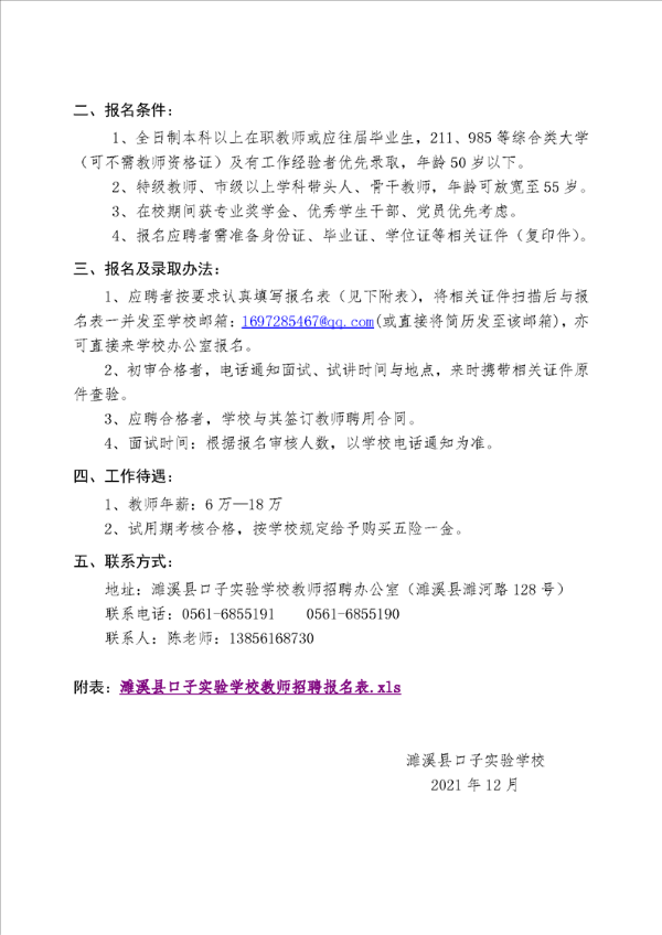 淮北市濉溪縣口子實(shí)驗(yàn)學(xué)校誠聘中小學(xué)優(yōu)秀教師啟事